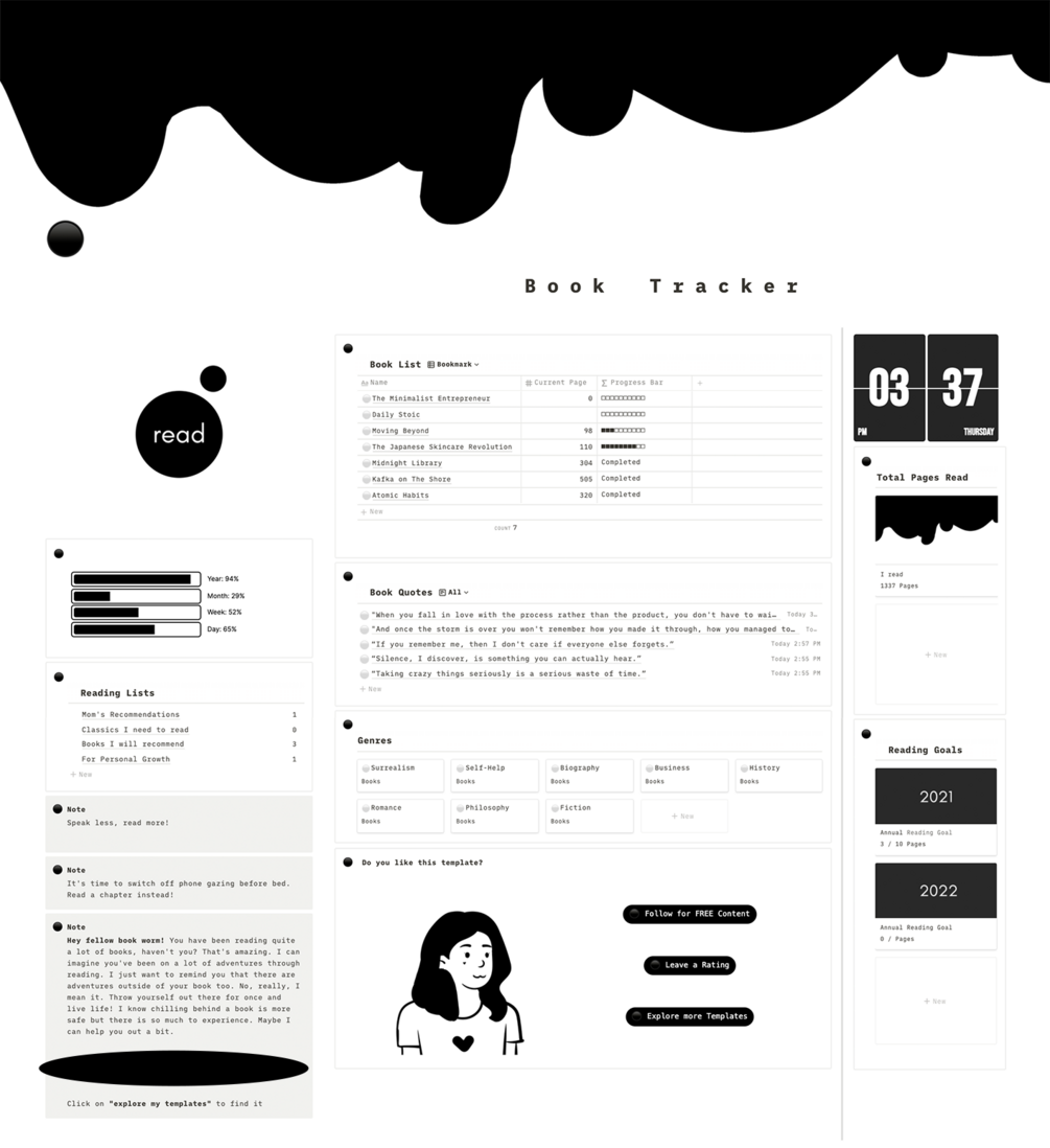 Looking for a simple and effective way to track your reading progress? The Notion Book Tracker Template has everything you need to organize your reading list, keep track of your favourite quotes, and stay on top of your reading goals.
